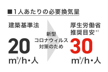 しかし現在のコロナ禍での指標では、1人=30m3/hとなっています。(厚労省HPより)